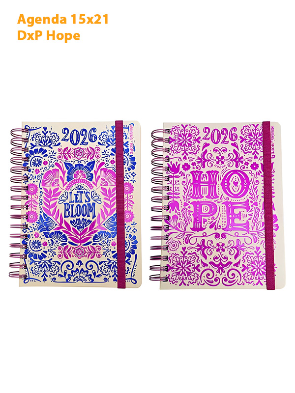 Encuadernación: espiral a tono con el diseño, que facilita apertura completa y escritura cómoda.
