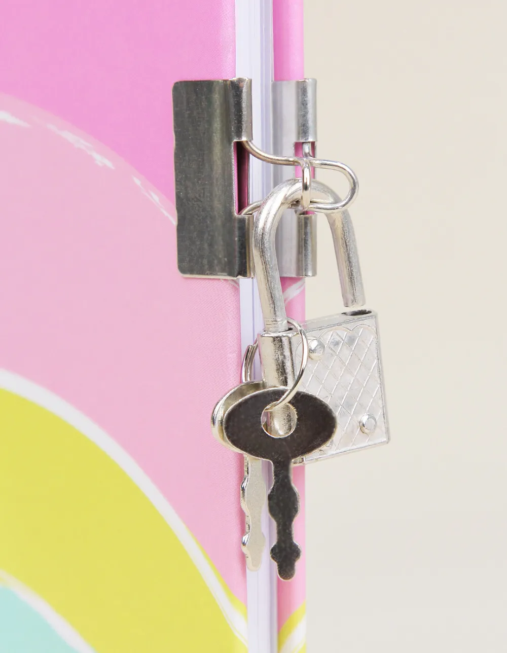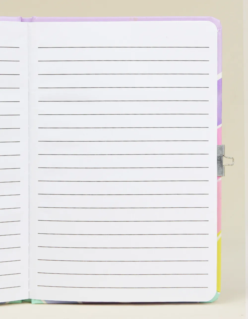 Cuaderno de tapa dura con 50 hojas rayadas. Incluye candado con dos llaves.