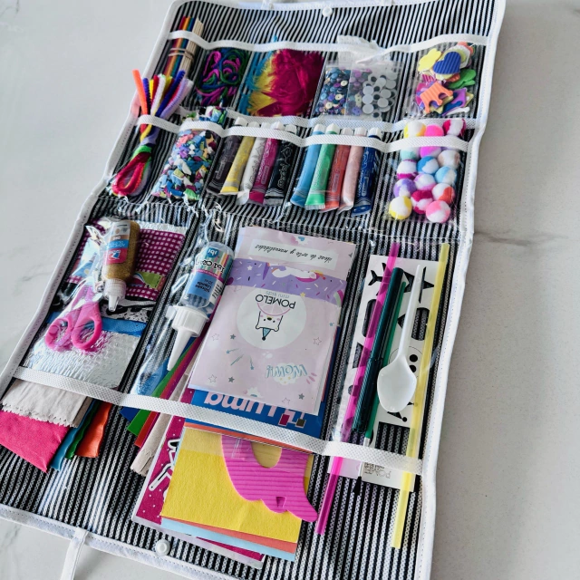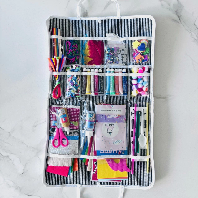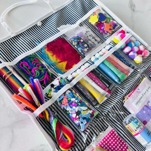 Valija organizador con divisiones de tela impermeable de fácil limpieza y botón a presión.